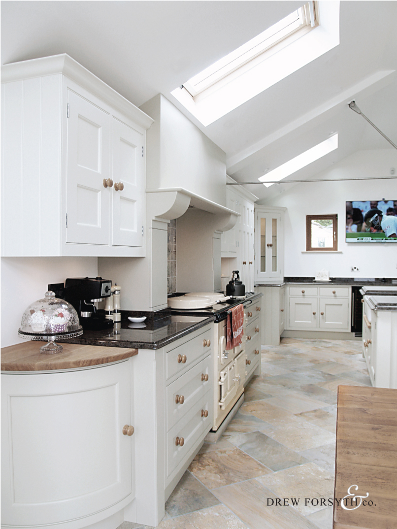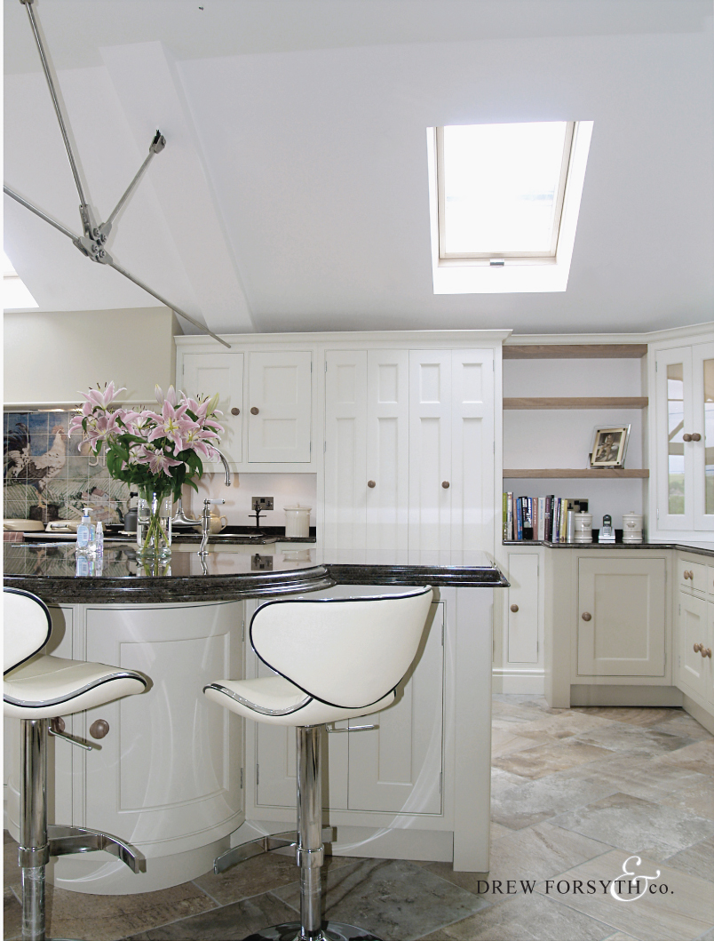 This large open plan kitchen dinner makes best use of the natural light. The beautifully angled island provides a great place to eat too.